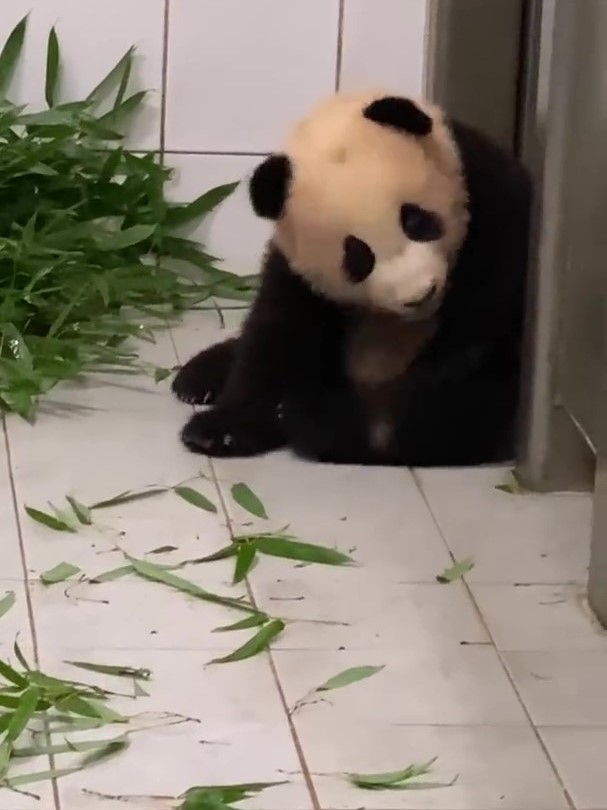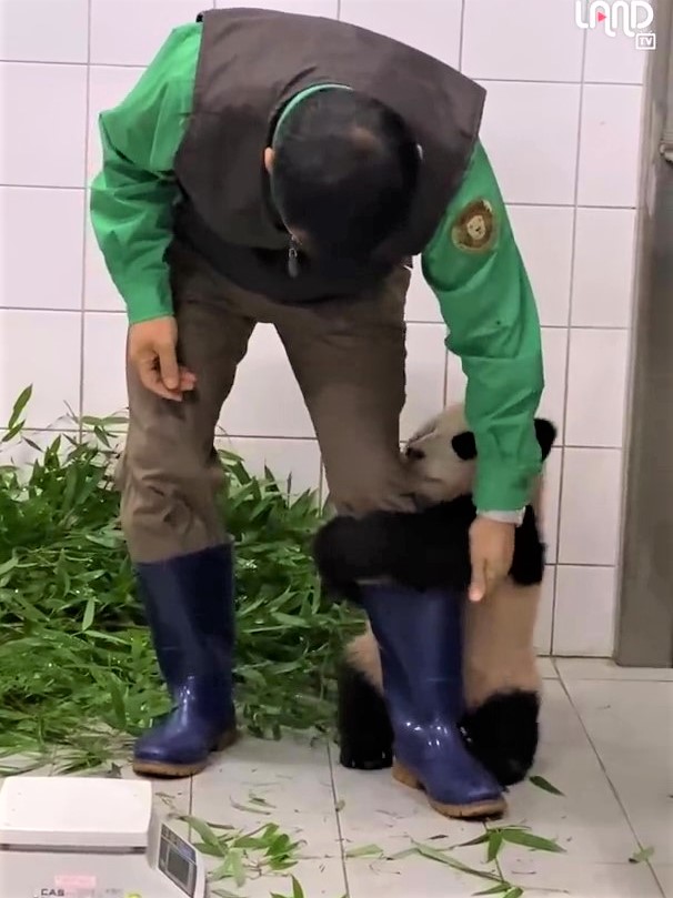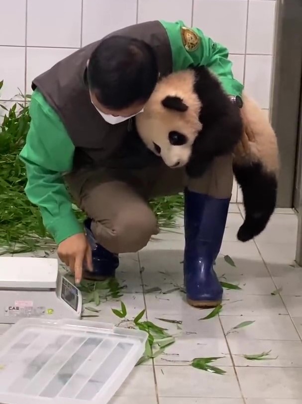 福寶是去年7月第一隻在當地出生的熊貓寶寶,在飼育員呵護備至的照顧下長得圓嘟嘟、健健康康的,和飼育員感情也特別好~這天飼育員來幫福寶量體重,一開始他一把抱起躺在角落耍廢的福寶,將牠捧到體重機前,「小朋友我們來看看你現在多重啦~」。
