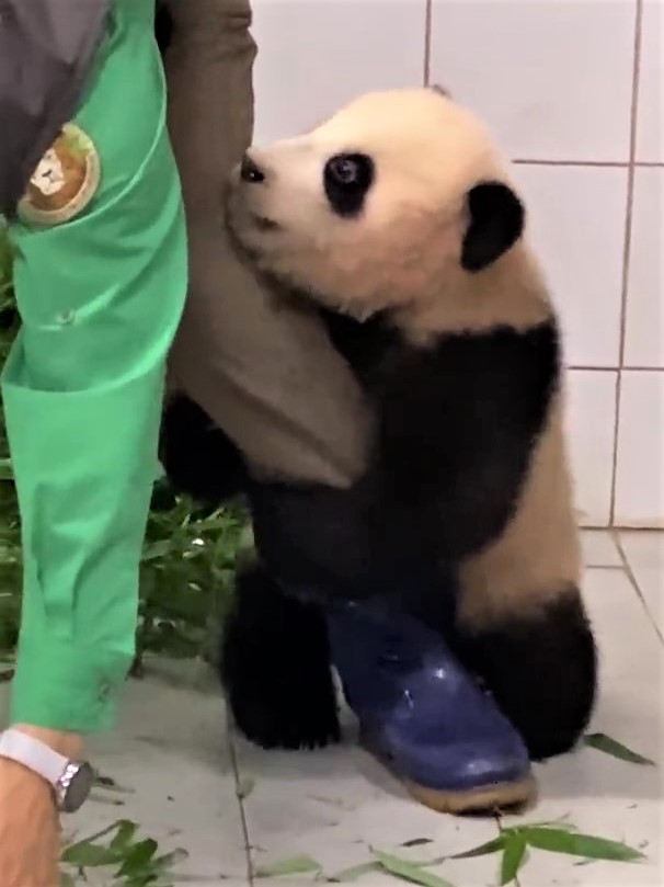 看完體重後,飼育員便起身要把福寶給放下來、準備離開去進行別的工作,沒想到小傢伙居然一把抱住了飼育員的腿,賣萌討關注的模樣讓人忍不住嘴角上揚啊www