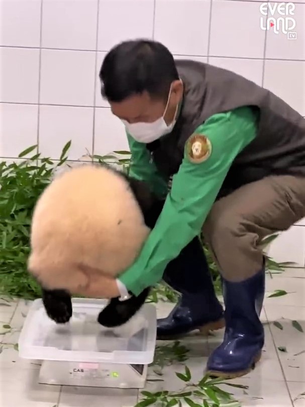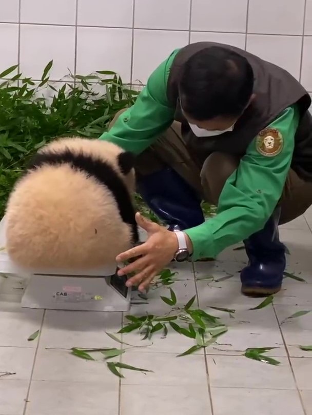 飼育員小心翼翼地將福寶放上去、並讓牠保持平衡秤重...「我們來看看你現在有多重喔~」