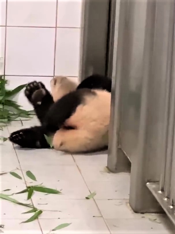 可惜飼育員真的要離開去工作了,只好讓福寶自己待著,而福寶被飼育員抱回角落後,似乎有些落寞無聊,又繼續百無聊賴地躺地耍廢了www