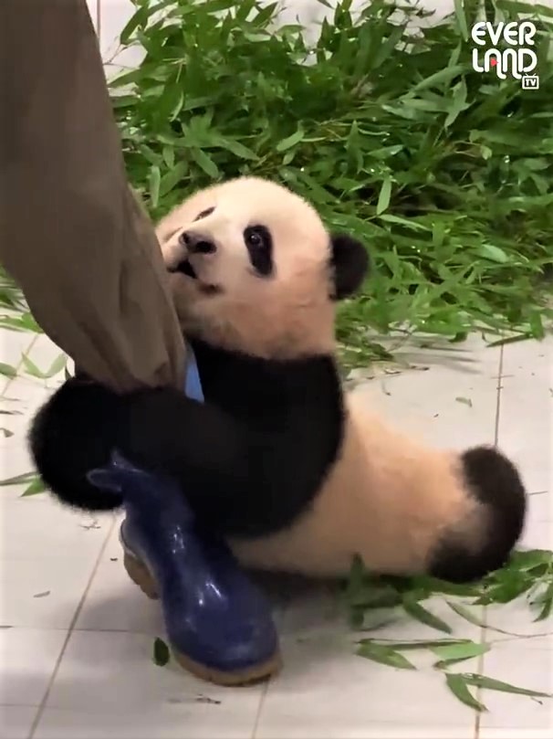 憨萌的熊貓寶寶光是憑著圓滾滾的可愛外表就已足夠療癒人心,再加上愛撒嬌的個性那又更加犯規、簡直把人給萌得不要不要得啊!韓國愛寶樂園有隻才6個月大的熊貓寶寶「福寶」(♀),非常依賴飼育員,只要飼育員一來,牠總會想要纏著人家~這天飼育員幫福寶量完體重後牠又趁機抱住人家的腿,不想放飼育員走的模樣好笑又可愛www