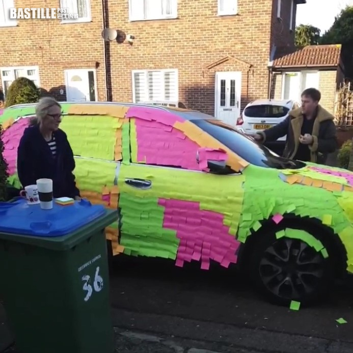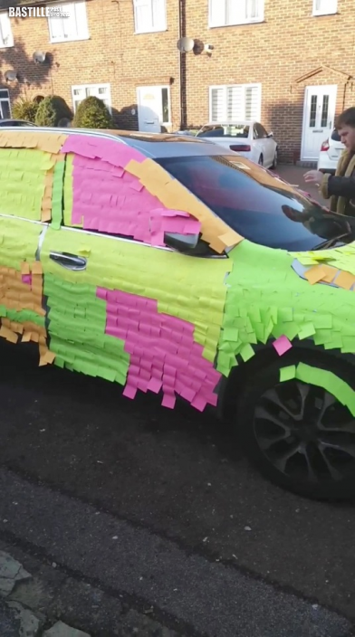 一些無良的車主為了自己方便會將車輛停在別人家的車道或門口,令人十分困擾。最近英國有位男子就遇到這種事情,他準備出門的時候發現有人將車停在自己的車道上,令他無法開車外出,十分氣憤的他於是找來好友合作,將大量的便利貼貼滿擋路的汽車車身,希望能警示對方。