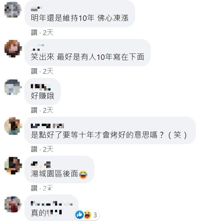 原PO的貼文發出後,立刻引起熱烈討論,發出4日就獲得1萬多個按讚數、近400次的分享,且有350多位網友留言,紛紛笑喊「明年還是維持10年,佛心凍漲」、「是點好了要等十年才會烤好的意思嗎?」、「碳烤十年都變成灰了!」、「十年之前,我不認識你」。另外,有網友透露店家在新莊,且多次經過,「新莊幸福東路上,從我小學到現在大學,還在那邊賣」、「我每次經過也以為是10元」、「在我家附近,但我沒有買過一次」。