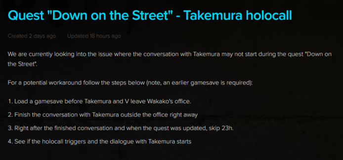 而當玩家遇到這個 Bug 後更會出現無法存檔的問題,直接重新讀取最近存檔亦會立刻觸發「武村吾郎」打來卻不說話的 Bug。因此代表在下一次更新前,遊戲進度將會停滯於此。不過 CD Projekt Red 亦有留意到相關問題,因此在官方論壇上提供了一個能夠暫時解決錯誤的方式。玩家必需讀取 V 和武村離開和歌子的辦公室之前的存檔,當 V 在辦公室外頭與武村的對話結束,並出現了任務進度的更新後,立刻在角色頁面中選擇跳過 23 個小時,便能觸發及順利完成與武村的通話。