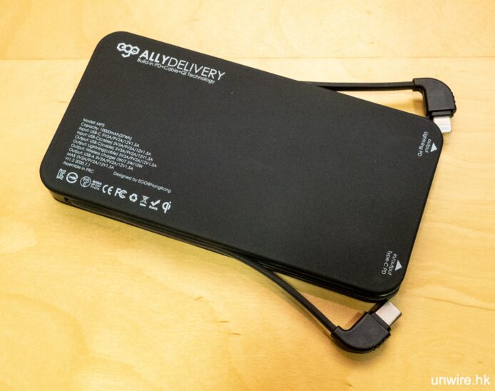 EGO@ ALLY DEVIVERY 10K 內置有 10000mAh 容量的電池,並已取得 Apple 的 MFI(Made for iPhone iPad iPod)認證,有一條可隨時收納在機身的 Lightning 充電線,反方向有另一條 USB Type-C 充電線,可隨時為 Apple 產品包括 iPhone、iPad、AirPods,以及使用 Type-C 的 Android 手機、流動產品充電。內置充電線好處,當然是你毋須帶著幾條充電線出街,在街上一拿出這個流動電源即可為你的電子產品充電,方便易用。