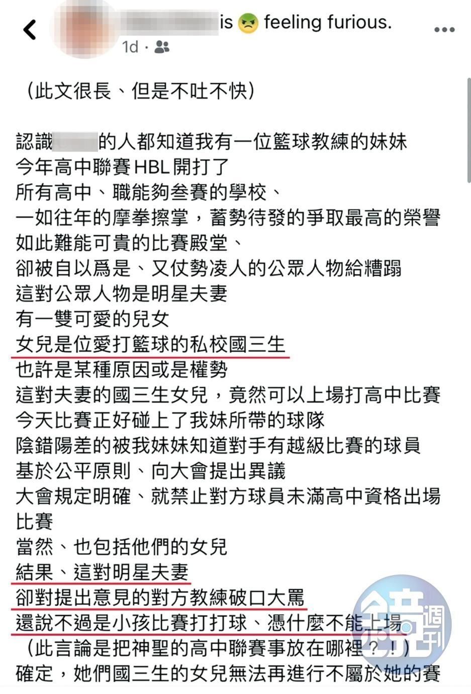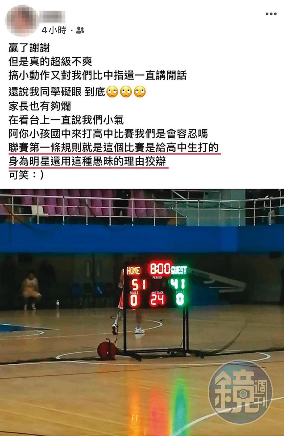 據悉,日前有讀者向《鏡週刊》爆料,他們的女兒荳荳參加高中籃球聯賽,雖然算是喜事一樁,但是因為該比賽限定高中生參加,荳荳明明就還在就讀國三,當天就被檢舉「越級參賽」,裁判跟敵方教練得知後,馬上就請荳荳下場離開、不許參賽,原本都是照規定來,誰知道李李仁竟然開始碎碎念,還脫口而出:「不過是小孩比賽打打球,憑什麼不能上場?」、「你們是不是怕輸?」等語,引起球員跟觀眾的不滿。