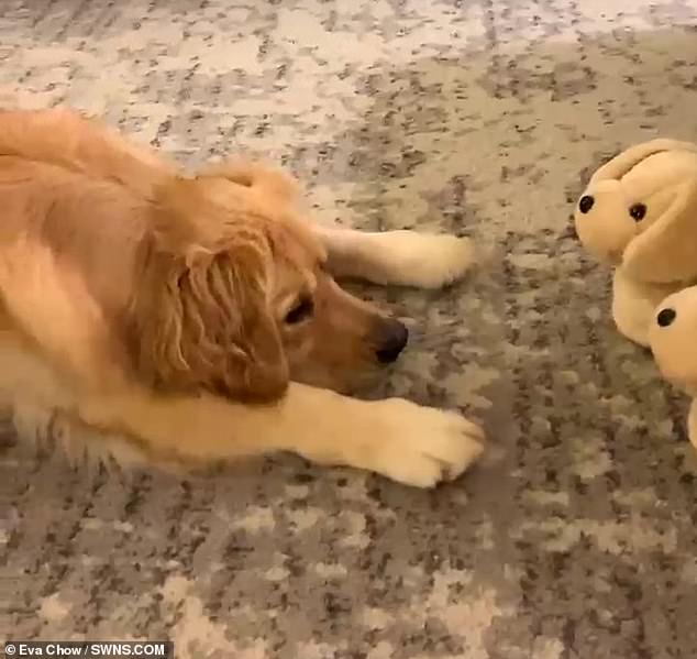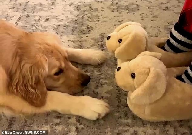 「主銀...尼怎麼沒跟我說家裡多了新的小狗狗...」住在美國西雅圖的女網友Eva Chow養了隻2歲的黃金獵犬Molly,這天她買了一雙可愛的新拖鞋回家,立刻迫不及待要分享給愛犬看,結果Molly一看到馬麻穿著這雙拖鞋卻瞬間懵了,呆呆地直盯著看,原來馬麻穿了一雙小狗造型的毛茸茸拖鞋...