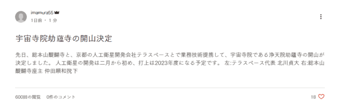 日前日本京都總本山醍醐寺宣佈將與人造衛星開發公司合作,建設一個漂浮在天上的神殿,並命名為「淨天院劫蘊寺」。醍醐寺預計計劃將於今年 2 月展開,並在 2023 年發射一個低軌道人造衛星作為「太空寺廟」之用,裡面會有一尊曼荼羅,另一半配備人造衛星基本功能,像是攝影等相關裝置。而該人造衛星將於高度 1000km 以下沿著地球運行,約 1.5 小時繞行地球一圈,其所在位置則可以利用 App 確認。