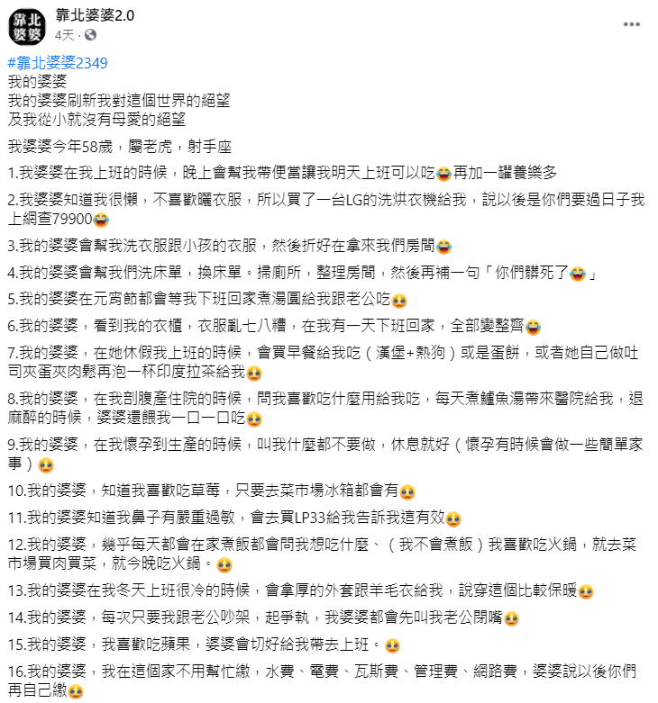 原PO在臉書社團《靠北婆婆2.0》中發文分享,自己的婆婆打破了她對世界的絕望,更讓從小沒有感受過母愛的她重新拾獲這份親情之愛。原PO更列舉出16點婆婆的好,包括親手做三餐外加幫上班的她帶便當,還有只要去市場一定買她愛吃的菜和草莓,甚至提到以前剖腹產完,婆婆每天辛勤的煮鱸魚湯帶到醫院餵她喝!