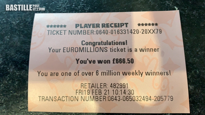 差之毫釐... 蘇格蘭一名24歲男子日前購買「歐洲百萬彩」彩券,頭獎可獲高達1.57億英鎊(約17.3億港元)獎金,當他核對彩券時,發現自己中了6個數字,本來滿心歡喜以為至少贏得二獎。可惜根據玩法,他只贏得4獎,獲分666.5英鎊(約7315港元),令他哭笑不得之餘,大嘆「我不能接受」。