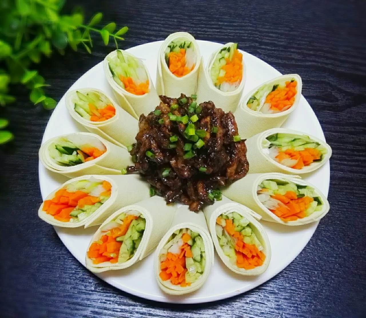京醬肉絲是一道傳統的北京風味菜,口味咸甜適中,醬香濃郁,風味獨特。把蔬菜捲入豆腐皮里,搭配炒好的醬肉一起,好看又好吃。