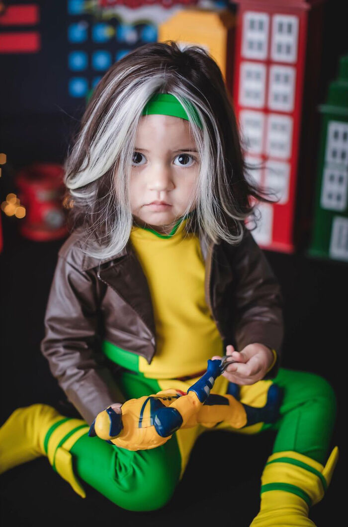最近瑪雅和媽媽也扮演了X戰警中的小淘氣(Rogue),綁上髮帶後更凸顯出額前的白色劉海,是不是非常特別又可愛呢?