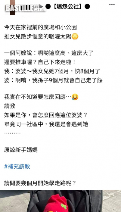 日前,有台灣媽媽在FB群組《爆怨公社》上發文,表示自己用嬰兒推車帶女兒去公園曬太陽,卻遇到一名老婦人搭訕,指孩子這麼大了還要推車,更問起小朋友的年紀,當她回答女兒7個月,快8個月時,對方則稱「我孫子9個月就會自己走了」。