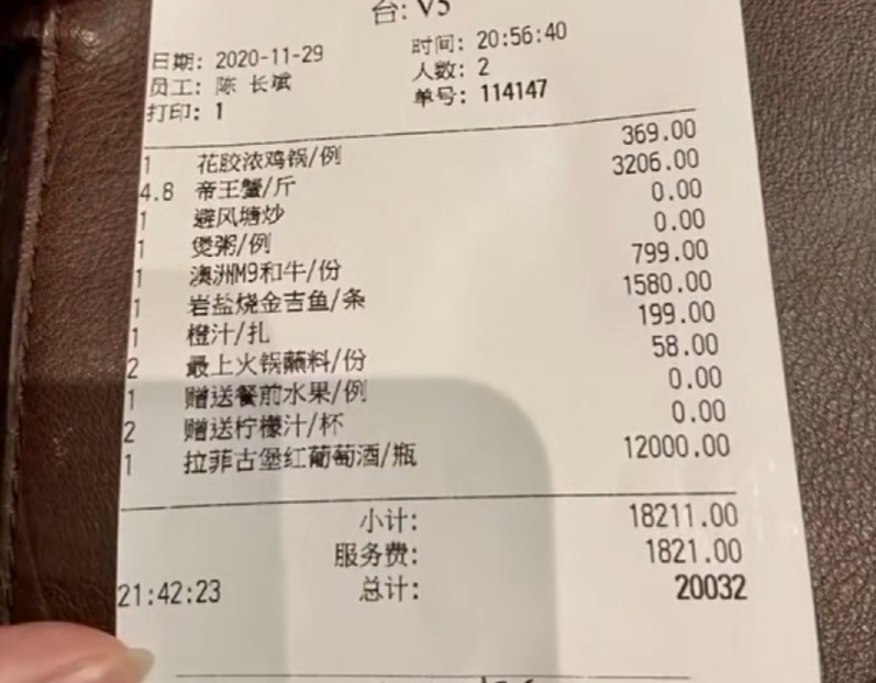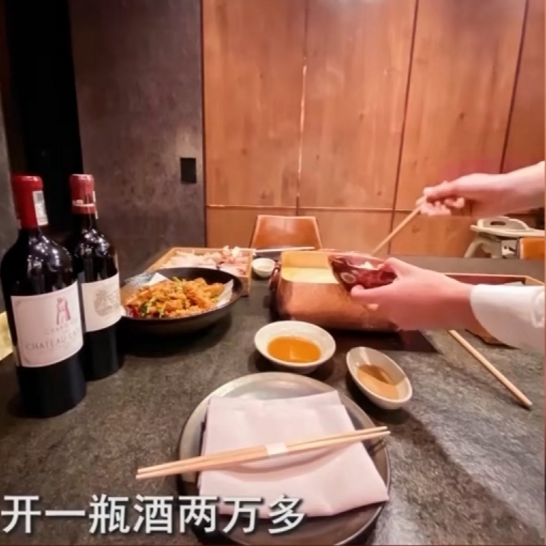如果單是以上這些名菜,還不足以吃掉20032元(約87000新台幣)的。不過楊女士稱,當時男方問她要不要來點酒,最後楊女士點了一瓶拉菲紅酒,價格12000元(約52000新台幣)。楊女士稱,餐單上還有一種名為羅曼尼康帝的酒,那個要20多萬(約100萬新台幣)一瓶,所以那個我沒有點,因為第一次見面,也不要這樣子消耗人家。