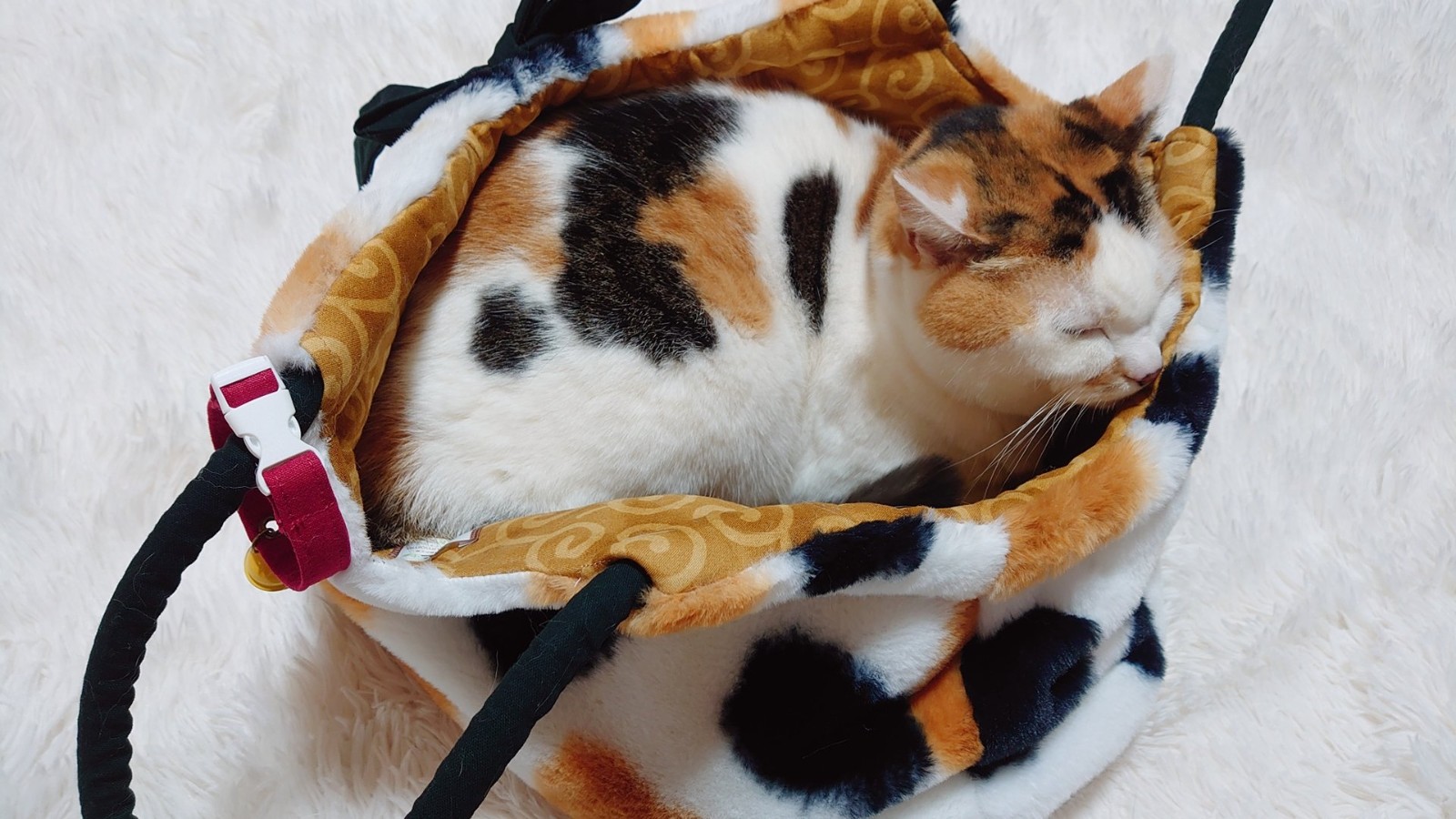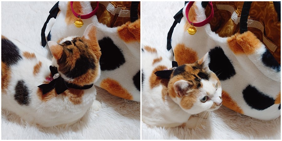 三花貓躺在這款包包裡面真的完全沒有違和感,根本就要合而為一了XD