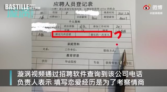 不少公司招聘都會提供履歷登記表供應聘者填寫。最近內地江西一名女子前往一間公司應徵,卻發現登記表上竟有「談過幾次戀愛」及「最長的一次多久」兩道涉及個人感情經歷的私隱問題,令她十分詫異。