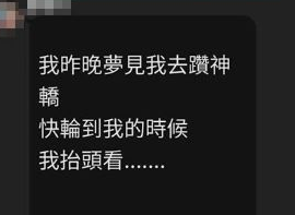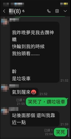 妹妹一看到自己要鑽進垃圾車底下,當場情緒一來,竟然就醒了,結果就沒好氣地,馬上傳到家裡的群組,所有人一聽到全都笑翻了!不過家人也透露,其實有點擔憂,雖然原本夢到神轎是好事,可是中間突然變成垃圾車,是不是有什麼「不好的預兆」?