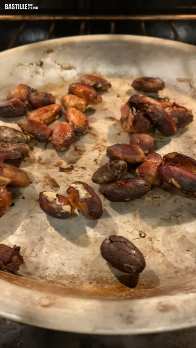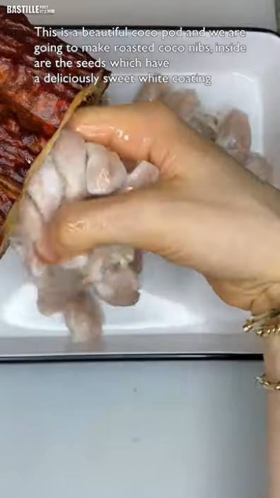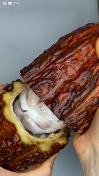 日前,TikTok網紅Sophia Rose發佈影片分享了「烤可可豆」的過程。從片中可見她先拿出一個巨大的「可可豆莢」,切開之後露出一排排整齊的可可豆粒,外面包著白色膜,透出裡面啡色的豆子。