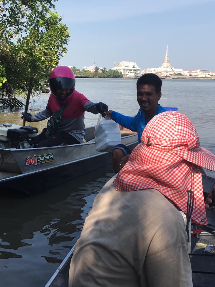 ▼這張照片是在北柳府的帕空河(Bang Pakong River)拍攝的,這條河距泰國曼谷約有1小時的車程。外送員穿著粉色外套,頭戴全罩式安全帽,在小船上努力划槳,應該是下機車後就換乘小船了。