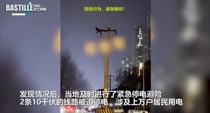 近日,內地成都市發生一起離奇事件,一名男子竟爬上高約十幾米高的電線桿頂部,做起仰臥起坐等動作,電力公司獲報後以安全為由緊急斷電,導致附近上萬戶住宅停電2個小時左右。涉事男子在經過警方勸說後,從電線桿上下來並未受傷,之後被警方帶走。