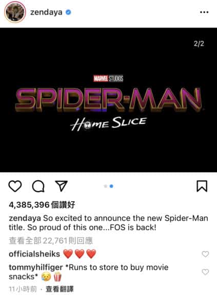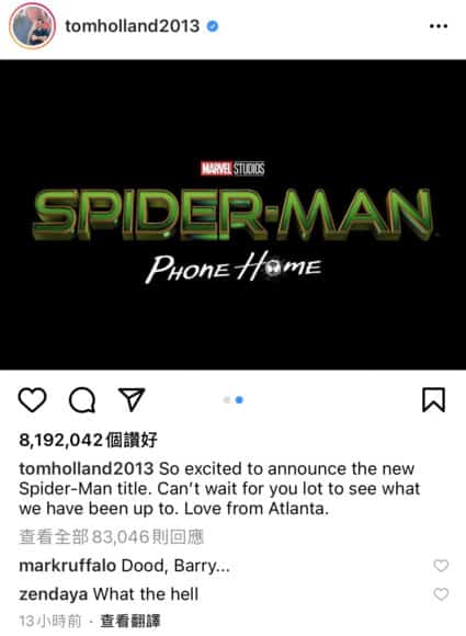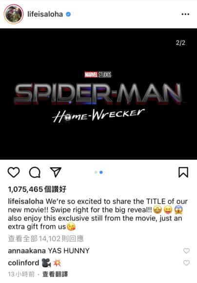 在大家仍然感到茫然之時,女主角 Zendaya 也加入隊列,發布新的劇照以及片名《Spider-Man: Home Slice》,而 Tom Holland 更直接於其帖文下留言,與網民一同表示疑惑,直言要向導演 Jon Watts 查詢清楚。