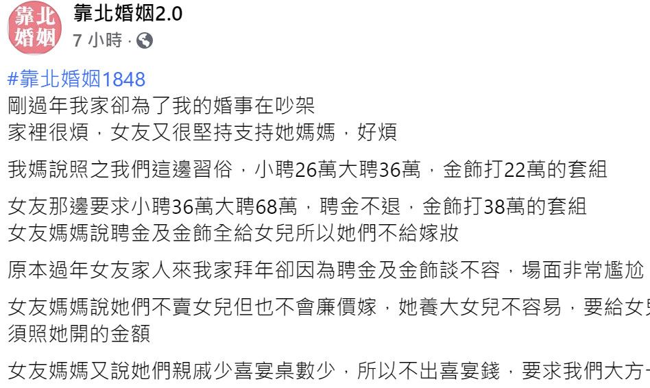 2021年03月01日戀愛是兩個人的事,但婚姻是兩家人的事~日前一名男網友在臉書社團「靠北婚姻2.0」表示,女友的媽媽堅持要104萬大小聘、38萬金飾,還要他負擔宴客桌錢和買房頭期款。這些花費林林總總共要500多萬。現在雙方家長僵持不下,他感嘆:「為何結個婚這麼麻煩?」