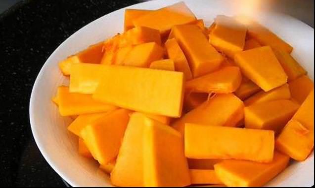 將南瓜洗淨去皮,之後切成小塊,在鍋中蒸十分鐘。