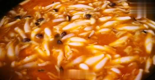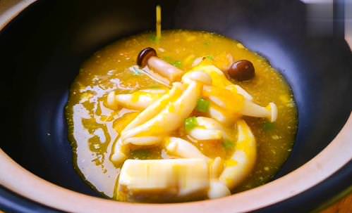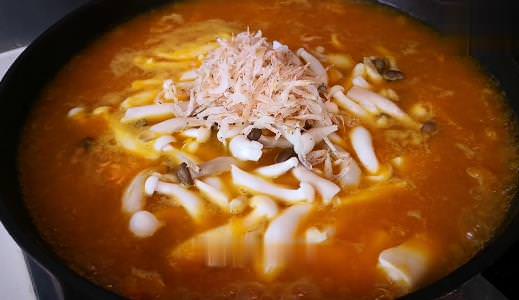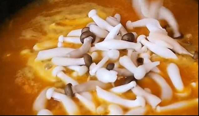 再加入一些配菜,豆腐,蝦皮,蟹味菇等,之後加上食用鹽。