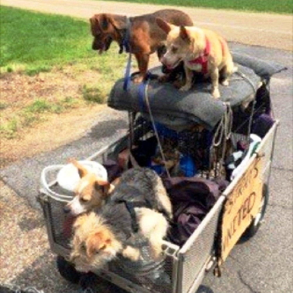 ▼大約15年後,Steve準備去印第安納州看望老友,當時他身邊有11隻流浪狗。他不捨得拋下狗狗,於是用自行車、購物車拼成一輛小車,載著狗狗們朝目的地前進。
