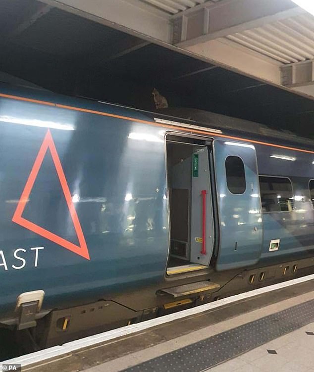 ▼當地時間2日晚9點左右,有民眾發現,倫敦尤斯頓車站的一輛火車車頂上蹲坐著一隻虎斑貓。這輛火車半個小時後就要開車,而且最高速時約為每小時125英里(約時速200公里)。不知道這隻貓咪是跟著高速行駛的火車從上一站來到這裡的,還是剛剛爬上去的。