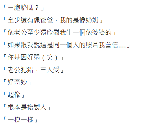 而網友的老公同樣也是給人一種很親和、好相處的氣息,只能說一家人真的假裝不了,一句話都不用說就能散發相似的氣場~~文章一發出立刻吸引許多網友關注,紛紛讚嘆「妳老公基因真強大」、「好可愛喔!不過三個寶寶長一樣真的好神奇」、「這是同個寶寶吧!」