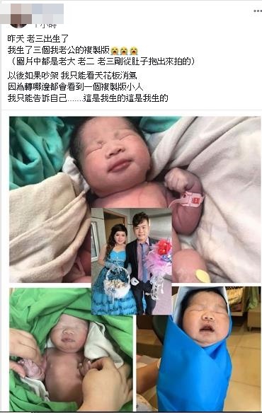 大家都說孩子真的不能偷生,因為一看長相就知道是不是一家人!近日,一名女網友在「爆怨公社」發文分享自己生下第三胎,接著還曬出夫妻合照以及三個寶貝小孩剛出生的照片,沒想到孩子們通通和爸爸長得一模一樣,讓她直呼:「根本老公複製版!」