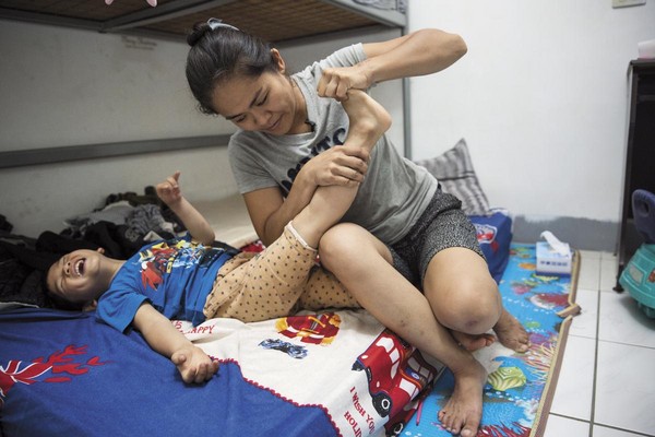 李沂沒有時間能夠傷心,她打起精神陪小兒子復健,無法工作的她只能向親友借錢,甚至向地下錢莊借錢,2年下來已經欠了百萬債務,全靠賣地瓜、賣水果、擺路邊攤、當美容中心按摩師等工作,沒日沒夜賺錢,才將債務連本帶利還清。每天忙於工作之外,還會幫小兒子典典按摩拉筋,幫他撐開僵硬捲曲的手腳。