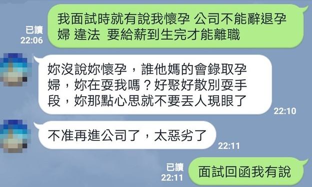 趙小姐認為離職事小,但是身為懷孕的媽媽,受到這樣的侮辱相當不堪,於是將對話紀錄公開PO上網路,從Line的擷圖可以看到,她一開始就表明,當初面試有說懷孕,公司辭退孕婦實屬違法!