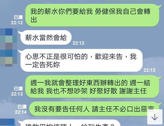 趙小姐後來心灰意冷,直言勞健保自己會轉出,但薪水還是要給,孰料主管講完好聚好散,卻繼續罵她「心思不正是很可怕的...我一定告死妳」、「誰敢用妳這種人,給到生產?」