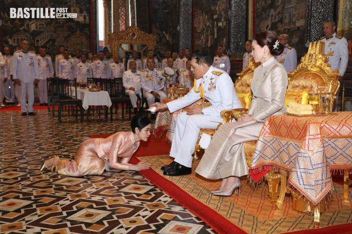 另一張照片中,在泰王面前,王后蘇提達跪坐在中間,而詩妮娜則和其他人員一樣必須全身跪趴,可見兩人的地位依然有差。