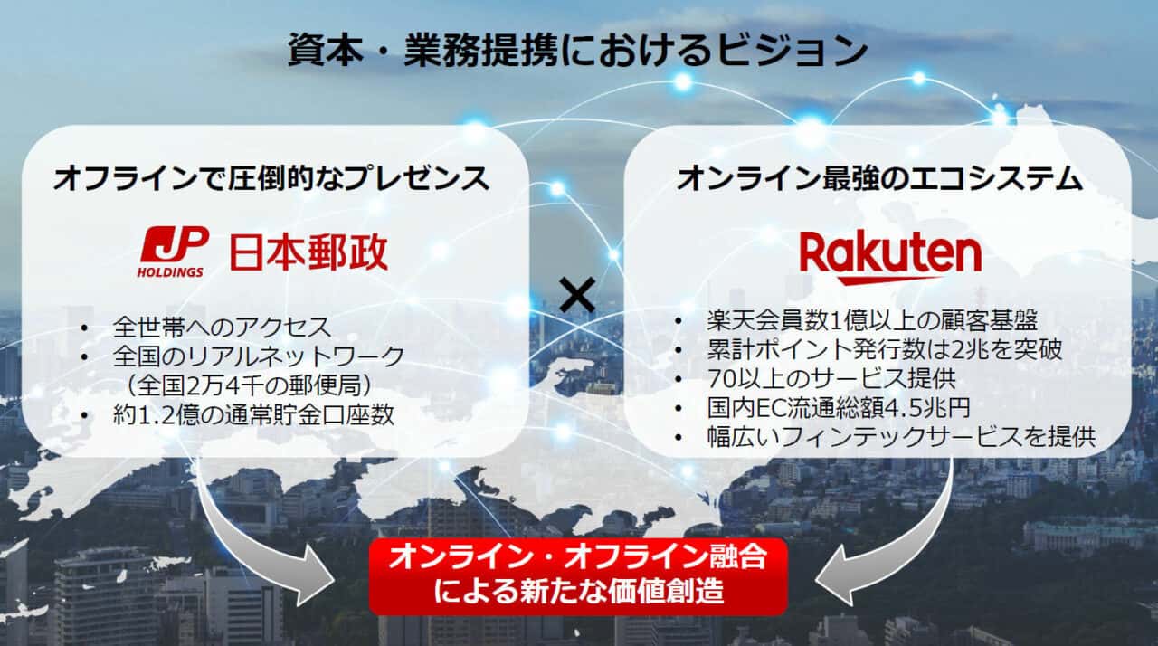 在合作計劃之中,日本郵政將會對樂天注資 1,499 億日元,取得其 8.32% 股份。未來兩家公司將會在物流、手機、金融、網購等方面作進一步合作,日本郵政將會採用樂天的科技提升物流業務的效率,以及改善網上服務,例如設立共同物流中心,以及開發更多自動化科技,對抗例如 Amazon 等等競爭對手。