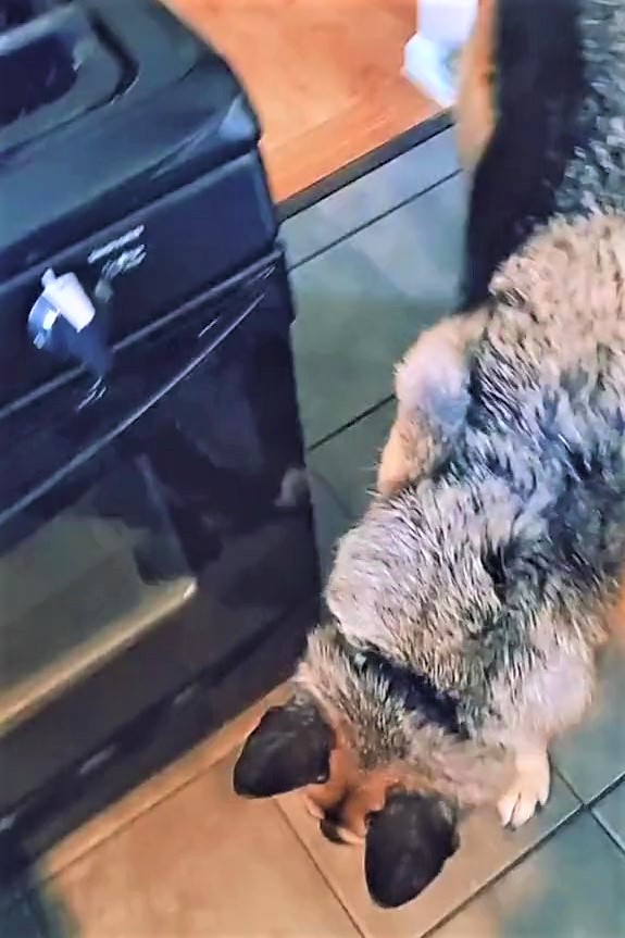 也因為亨茲無時無刻都在進行「食物巡邏」,不知道從哪時開始,牠就觀察到只要馬麻在廚房裡喊個口頭禪或語助詞「哎呀(Oops)」、「可惡(dammit)」、「Shit」,就是她不小心弄掉了什麼食物,這時候亨茲就會立刻衝過來檢查地板、看需不需要「幫忙」——幫忙吃掉www