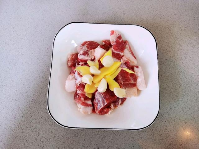 1、 首先準備好所有需要的食材。準備好之後生薑切片,蒜切末。梅花肉清洗乾淨,瀝乾水分。