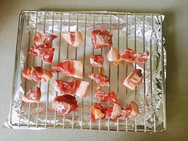 4、 烤盤上面鋪上一層錫紙放在烤網下面接油,烤網上面刷上一層油,然後把醃製好的梅花肉塊均勻的攤放在烤網上面。