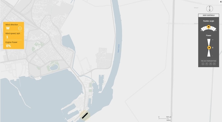 ▼在這個網頁遊戲中,玩家化身長賜輪的船長,操作這艘船穿越蘇伊士運河。透過鍵盤的方向鍵就能操作,上下鍵是加減速,左右鍵是控制方向;左邊還有黃色的表格顯示風向、風速和引擎力量。右邊則顯示出現在航行的方向、引擎的力量等等。