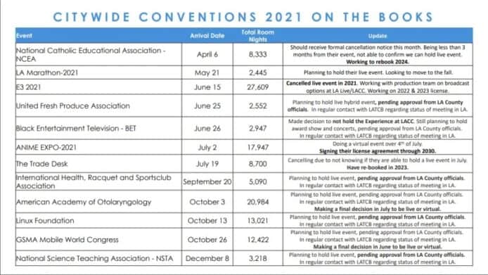 有網民發現洛杉磯的會議和旅遊發展委員會,早前已經在官網公佈了今年 4 至 12 月,當地的大型展覽活動和安排。根據委員會的說法,E3 2021 原定在 6 月 15 日舉行,實體展覽活動已經取消,委員會表示會與主辦單位的製作團隊洽談在兩個場地進行廣播,並且有關 2022 和 2023 的活動舉辦安排。