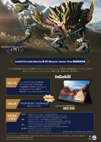 而為了慶祝 Monster Hunter Rise 推出在即,Intehill 更特地舉辦「Intehill HS156PEQ 送 NS Monster Hunter Rise 遊戲優惠活動」,只要於活動期間在指定商店購買 Intehill HS156PEQ 便攜式螢幕一部,即送 NS Monster Hunter Rise 遊戲乙套。活動時間由 3 月 26 日開始,並且限量 50 個名額,因此有興趣的朋友要注意了,若有任何問題,可到官方網站或到指定商戶查詢。