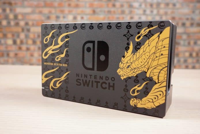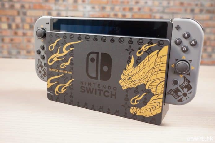 ▲主機外今次最特別設計就是Dock底座,印有主要魔物「怨虎龍」的圖案,還有遊戲名字MONSTER HUNTER RISE