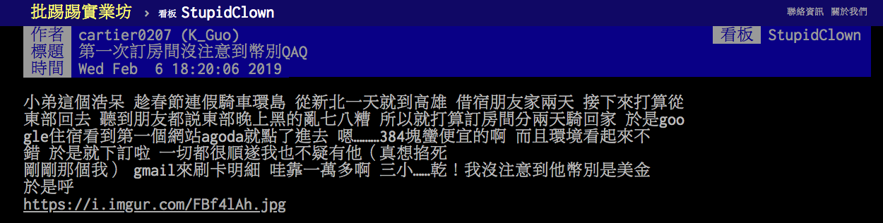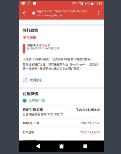 就在他點進訂房網站時,馬上就看到了一間只需要384元,並且整體環境也相當不錯的房間,於是就立馬下訂了。他表示整個過程都非常順利,「我也不疑有他,還覺得自己撿到了大便宜!」但是就在他刷卡完成後的下一秒,手機傳來了刷卡明細,而當他打開來看時,卻發現上面竟然寫著「TWD14254.41(已含稅金和服務費NT$1912.76)」,頓時晴天霹靂,原來是他自己沒有注意到網站上顯示的是「美金」。更讓他崩潰的是,信息上還特別註明了「不可退款」四個字。
