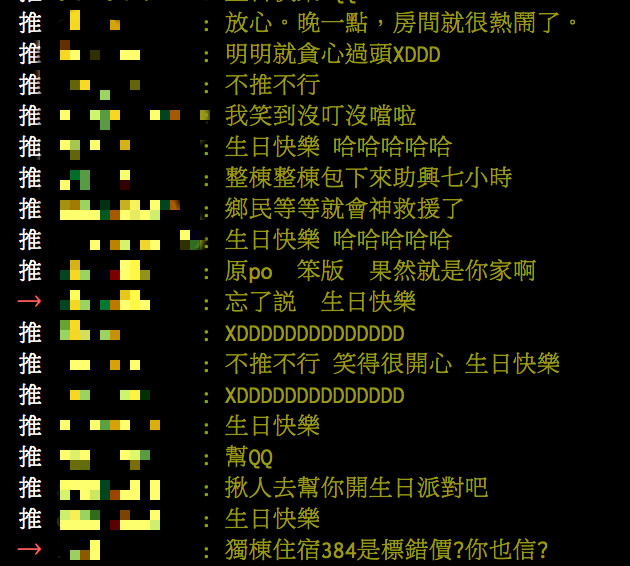 最後,他無奈在網路上開揪,「有沒有人要來花蓮陪我玩?一個人住獨棟4房4衛浴,老闆會不會以為我會影分身?」如此天兵的舉動,讓網友們看了都笑歪,紛紛留言表示「可憐幫你QQ」、「正港笨版人哈哈哈」、「你可以一天洗4次澡,3小時換一間睡,物盡其用啊」。而原po還自己透露,隔天是他的生日,讓其他鄉民更是直笑「你可考慮開趴 XD」、「最深刻生日禮物!」