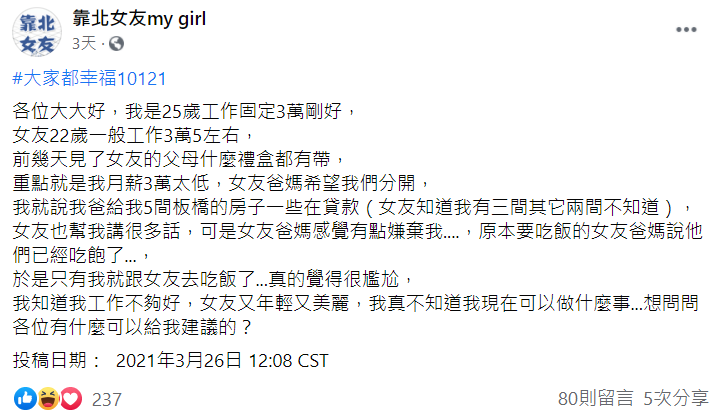 原PO在臉書社團《靠北女友my girl》中發文表示,今年25歲的他薪水落在3萬元,而22歲的女友則是月收3萬5,足足比他高出5000元。前幾天原PO帶著禮盒去見了女友家長,雖然女友一直幫忙講好話,但他還是明顯感受到對方爸媽的不滿,甚至直接表明希望2人好聚好散,正是因為覺得他的薪水太低。