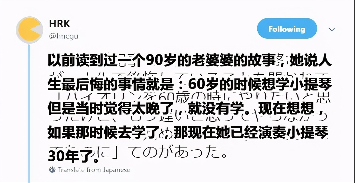 60歲時想學小提琴,但覺得太晚了,就放棄了,到90歲時這件事卻成了人生最大的遺憾。我們人生往往最遺憾的事情不是做過沒做好的,而是想做卻還沒做的事情。