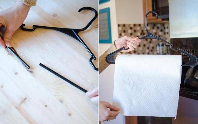 都這樣了,還是有用~做廚房用紙架!衣架中間的缺口正好穿過紙巾卷,掛在櫃門上,這樣用起來超方便。