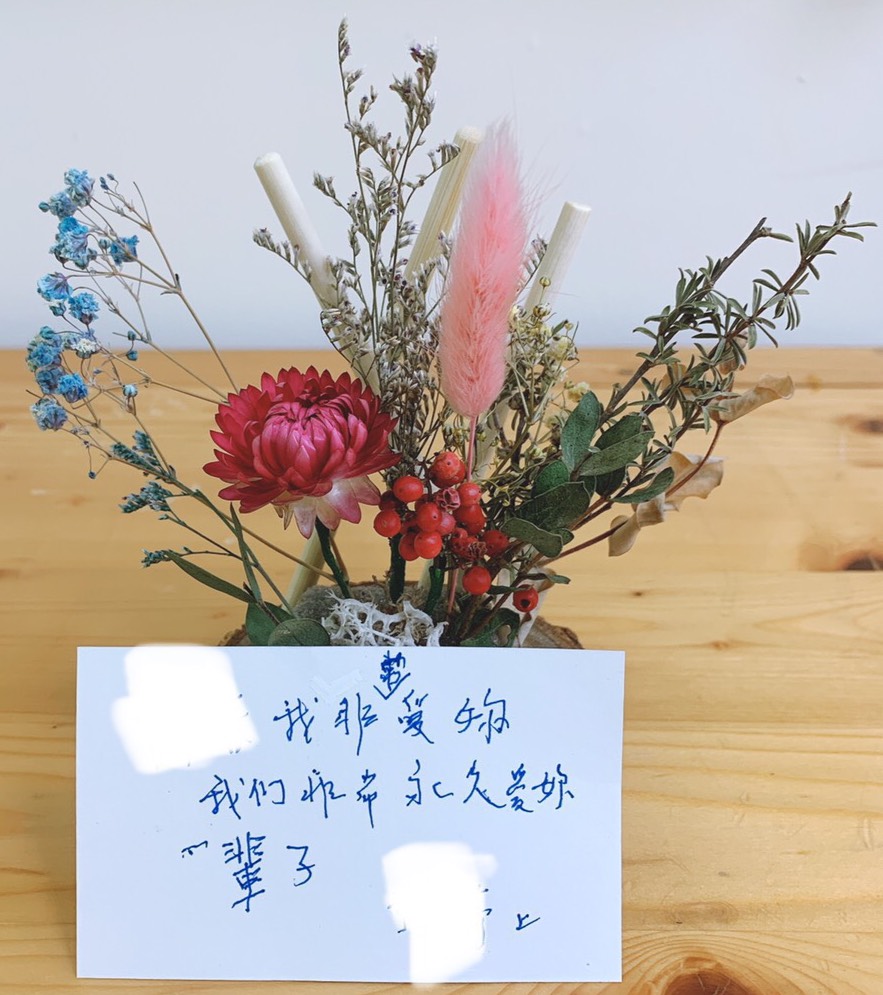 植樹節那天,護理之家讓住戶們製作乾燥花,爺爺把這當作禮物獻給亡妻,並眼眶泛紅地寫下卡片:「我非常愛妳,我們非常永久,愛妳一輩子。」並夾在製作好的乾燥花上,一番真情告白,讓許多工作人員紛紛動容,護理之家也表示,奶奶離開後爺爺非常傷心,團隊們正在給予輔導和關懷,並帶著他一起禱告,希望他能得到安慰、好好恢復。